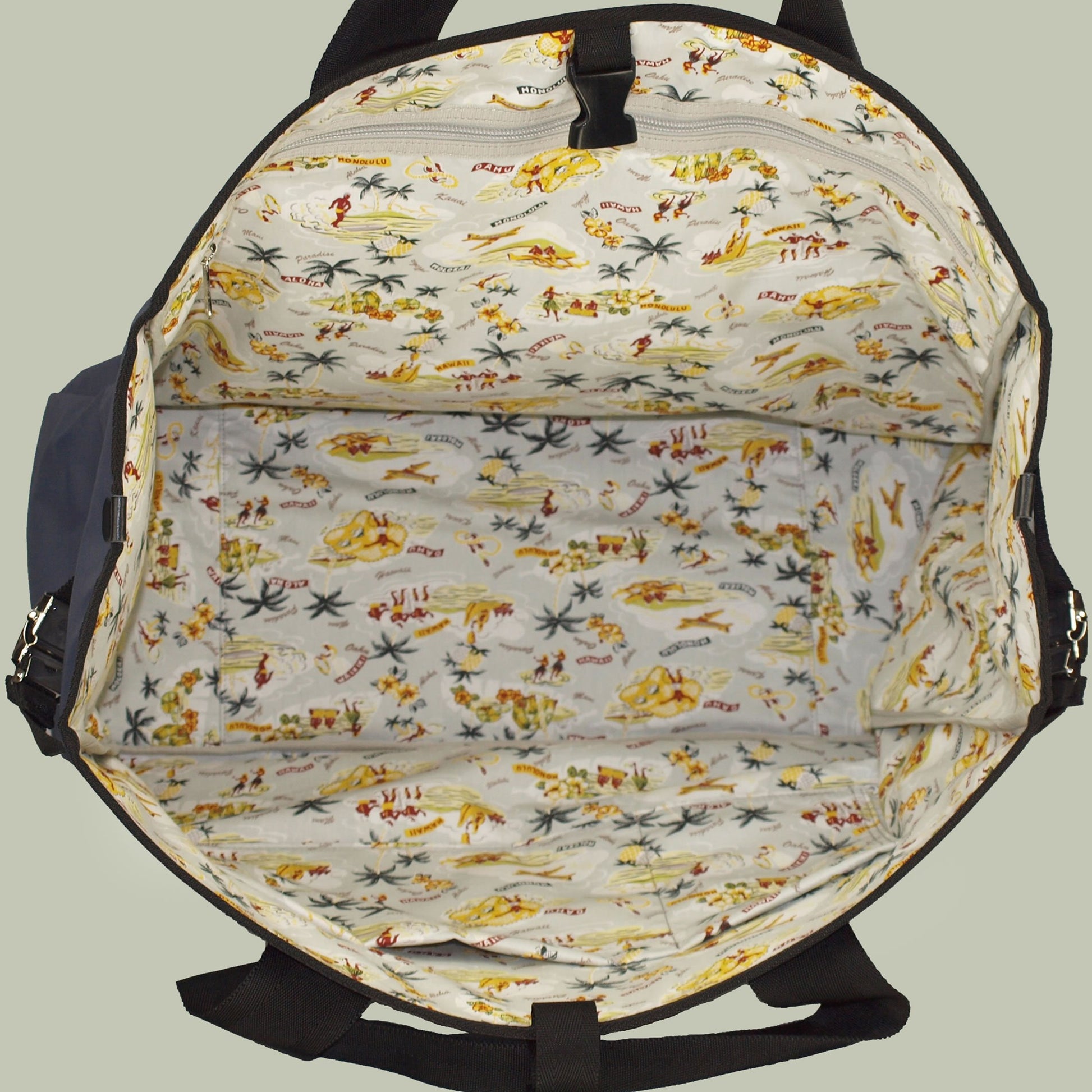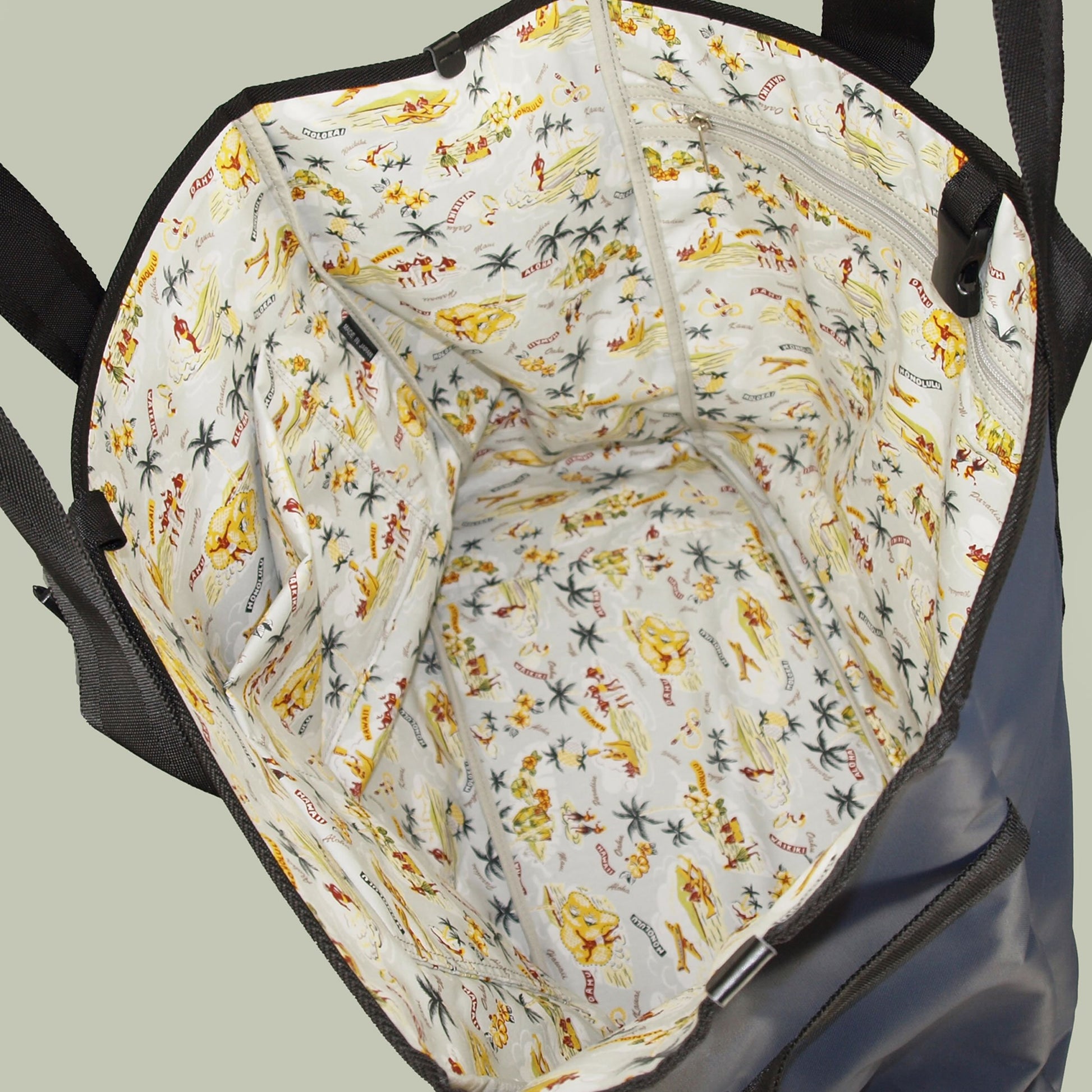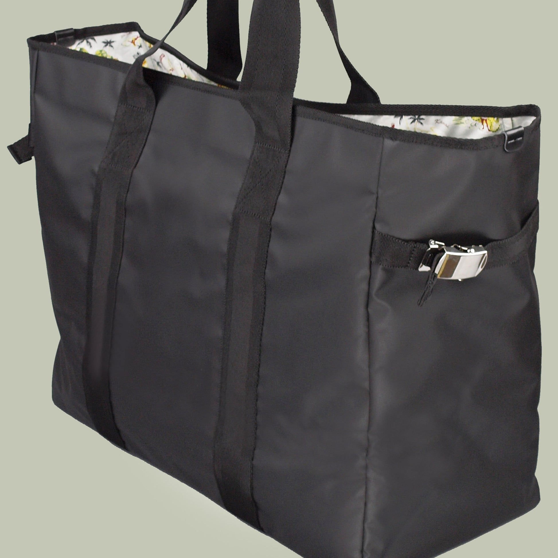 ナイロン生地にポリカーボネットをコーティングした軽くて丈夫な生地で作ったレジャーにおすすめのデカトートバッグ。折り畳みの椅子やレジャーマット等もこのバッグ1つでOK! 内装はハワイアン調のコットンを使用、サイドのGIバックルでマチ巾調整できます。カラー/ブラック、ネイビー サイズ(横×縦×マチ):50×40×20cm 重量:770g 日本製
