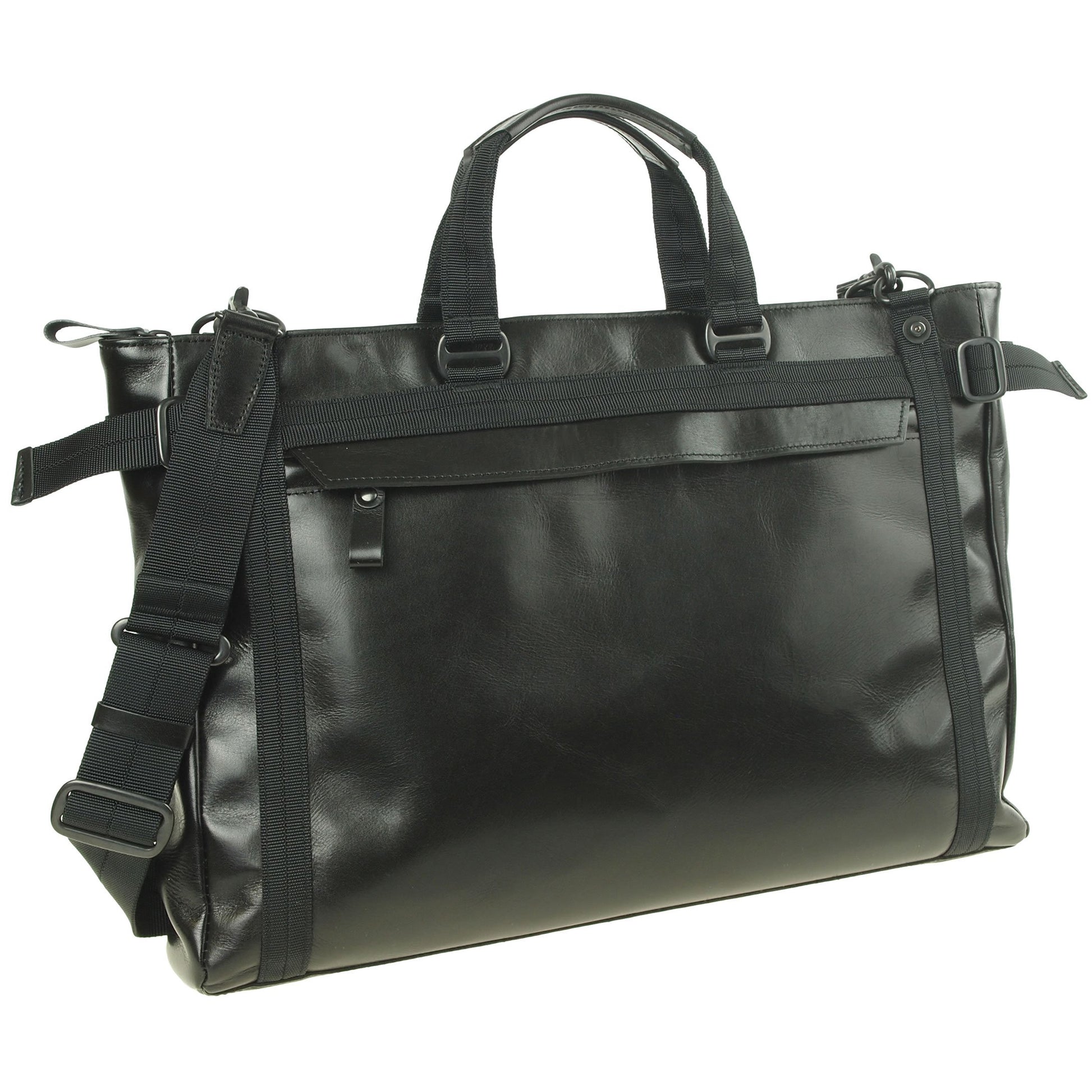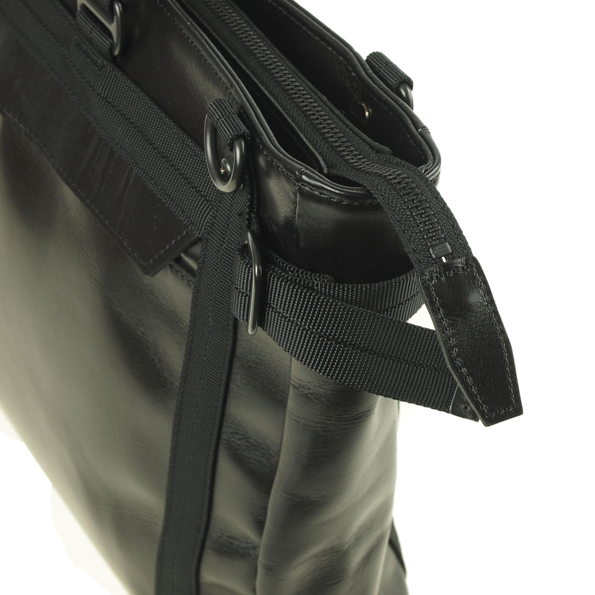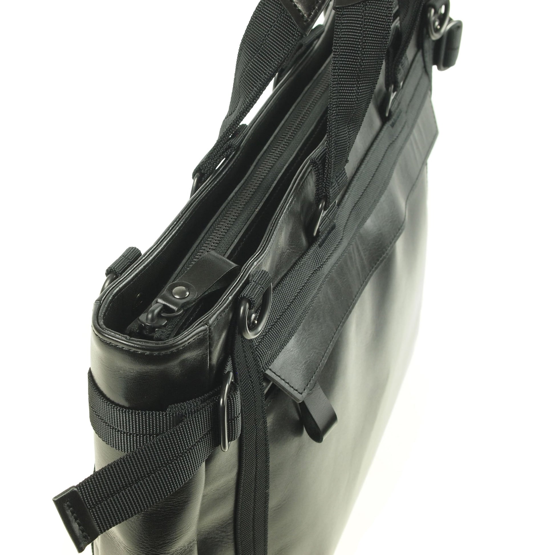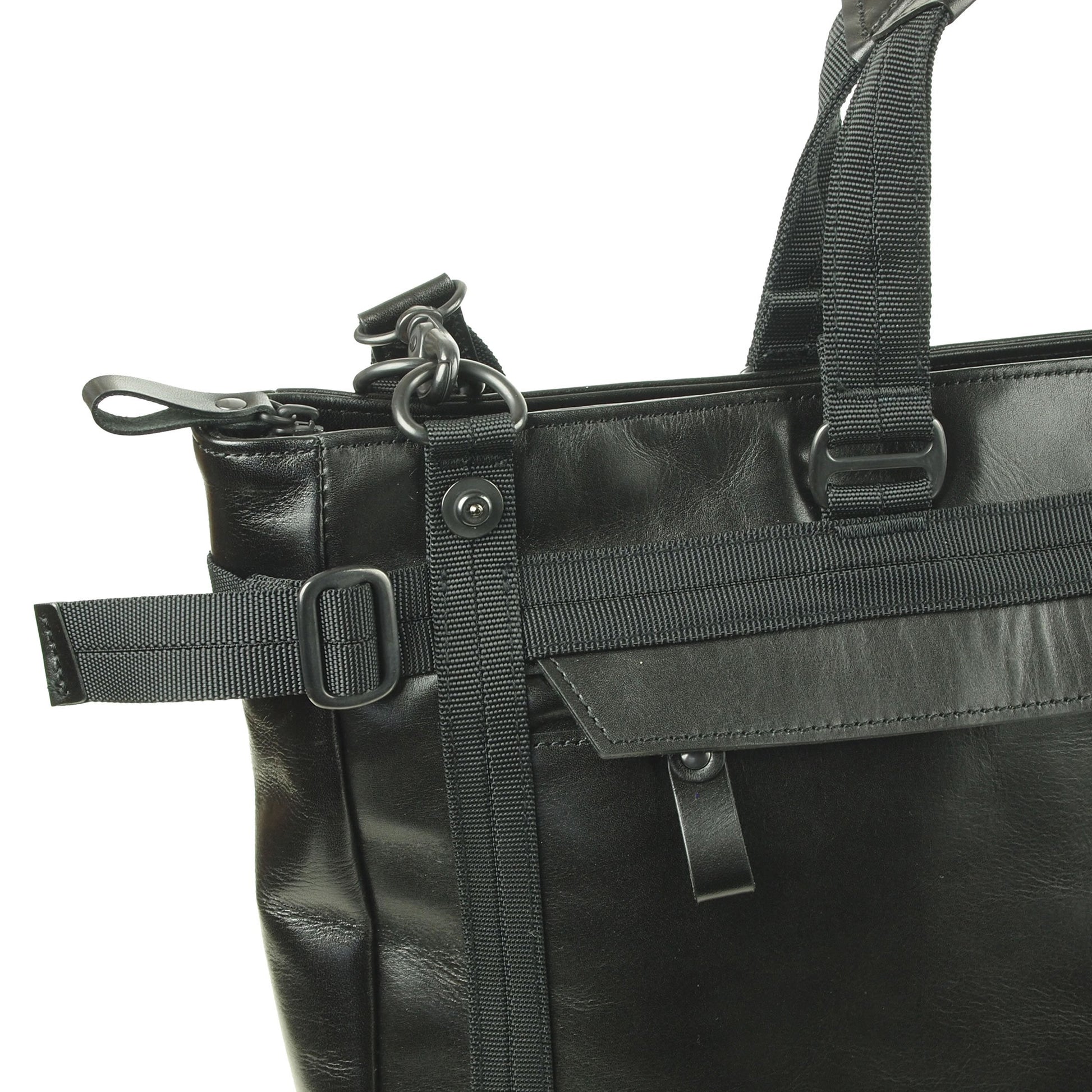 ワックス加工の牛革にナイロンテープのトリミングが新鮮。牛革とテープを組み合わせたオリジナルのハンドルは持ち易く、両サイド4つのDカンにショルダーストラップを掛けるとバランスの安定したショルダーバッグで使えるマチ細バッグです。カラーはブラック。 サイズ(横×縦×マチ):40×29×7cm 重量(本体のみ):850g 日本製 (染料仕上げの牛革使用の為、多少の色落ちがする場合が有ります)