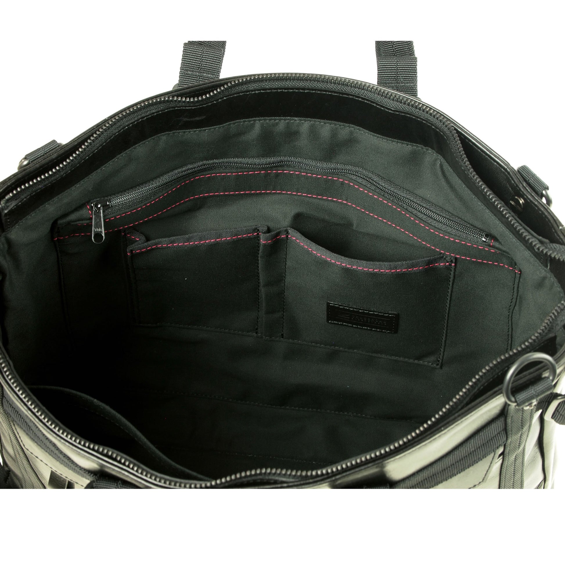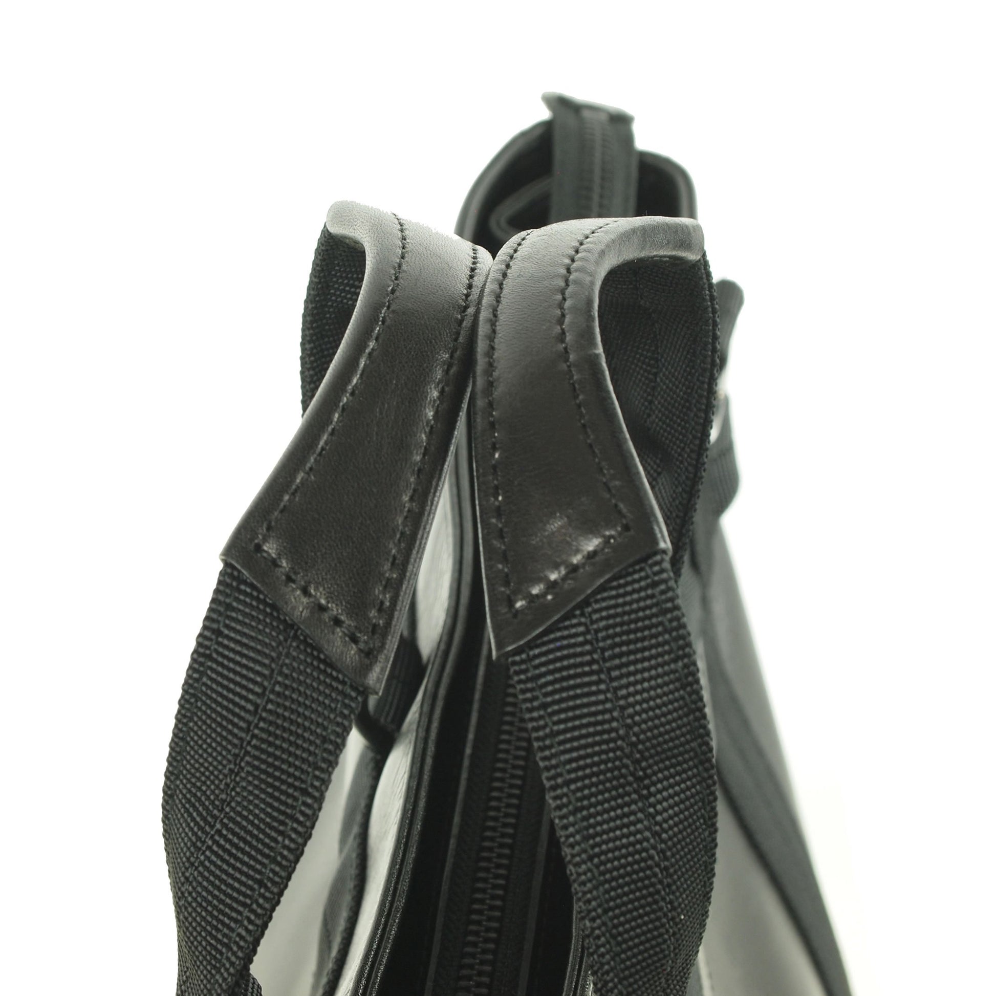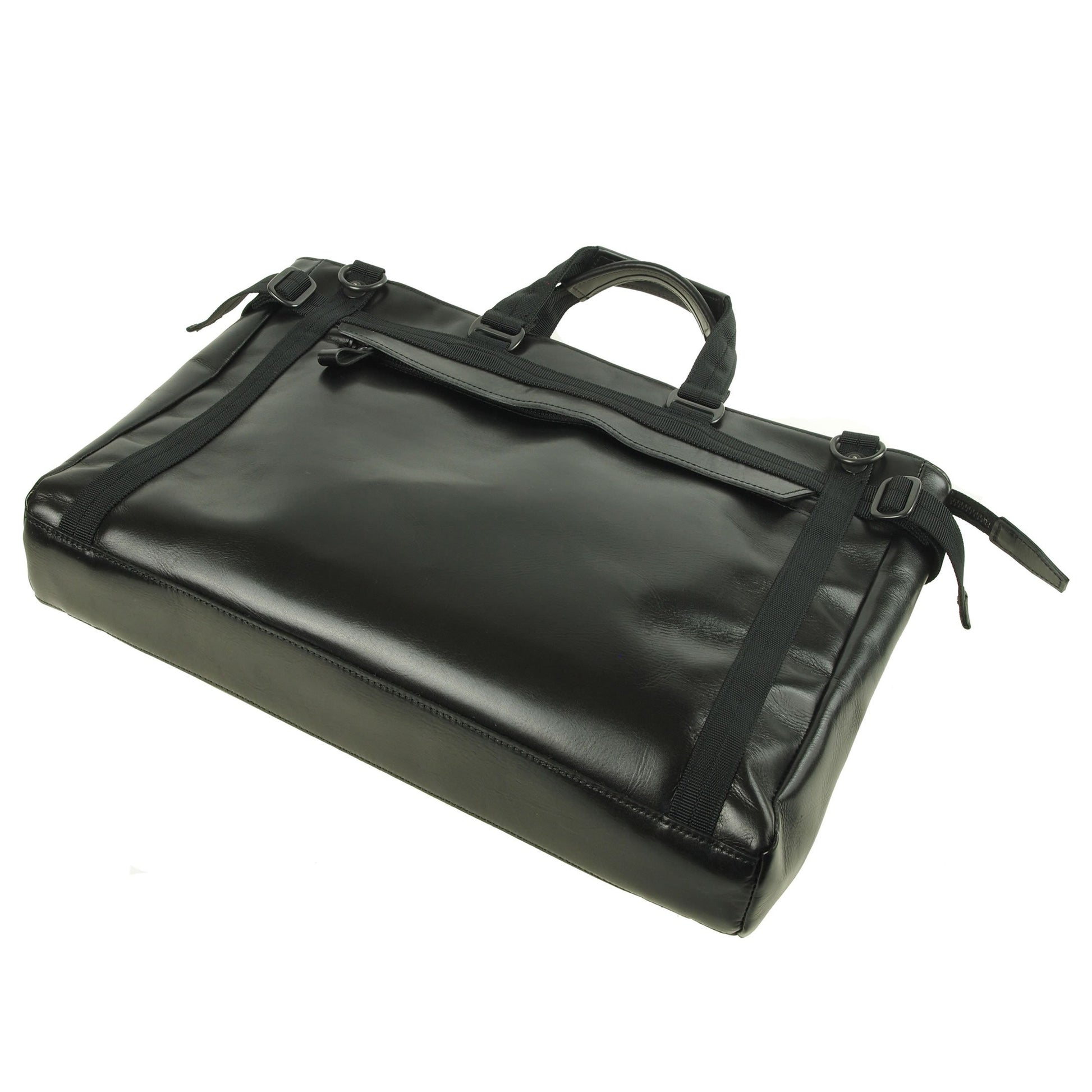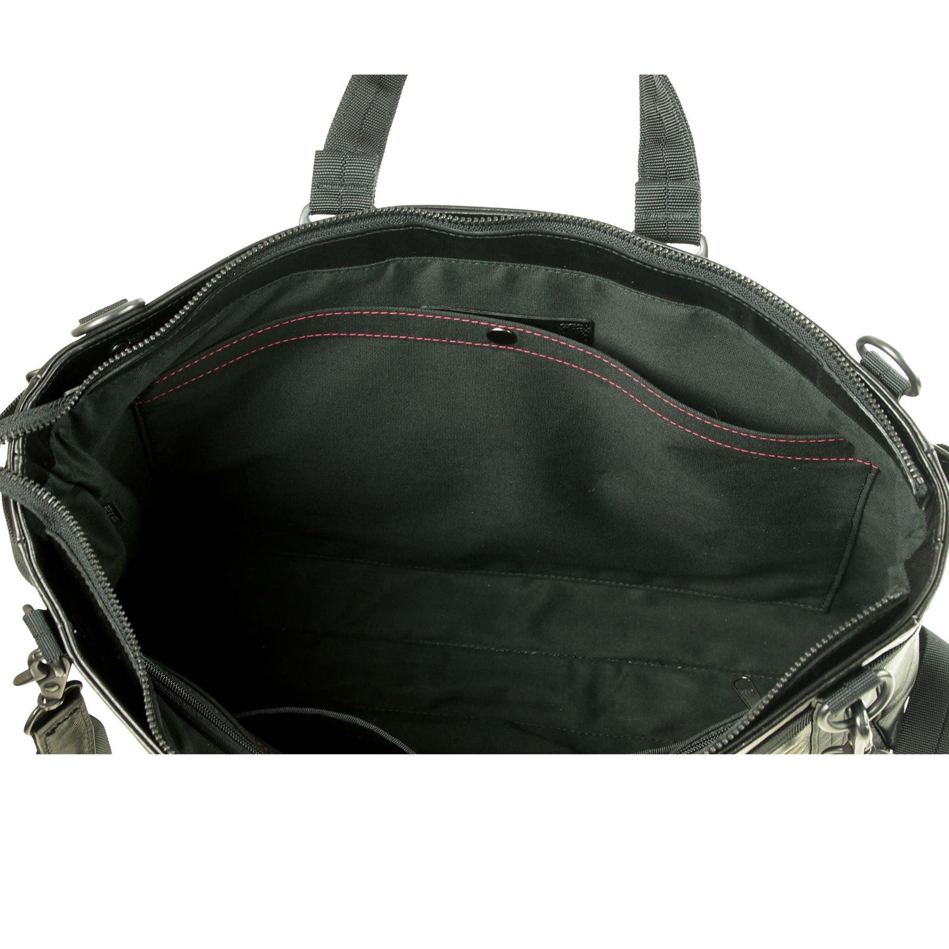 ワックス加工の牛革にナイロンテープのトリミングが新鮮。牛革とテープを組み合わせたオリジナルのハンドルは持ち易く、両サイド4つのDカンにショルダーストラップを掛けるとバランスの安定したショルダーバッグで使えるマチ細バッグです。カラーはブラック。 サイズ(横×縦×マチ):40×29×7cm 重量(本体のみ):850g 日本製 (染料仕上げの牛革使用の為、多少の色落ちがする場合が有ります)