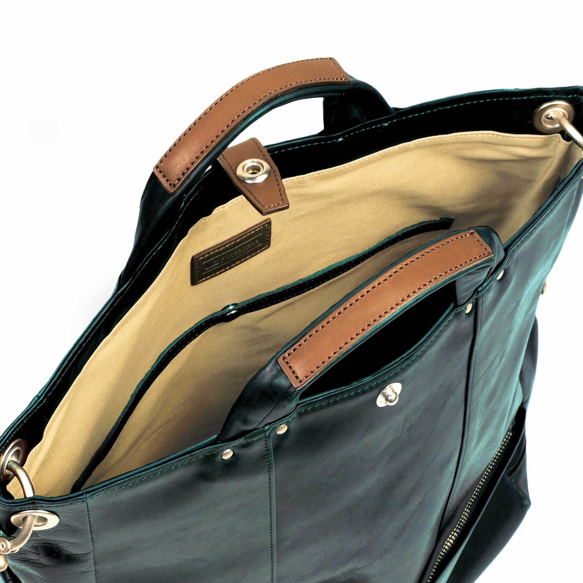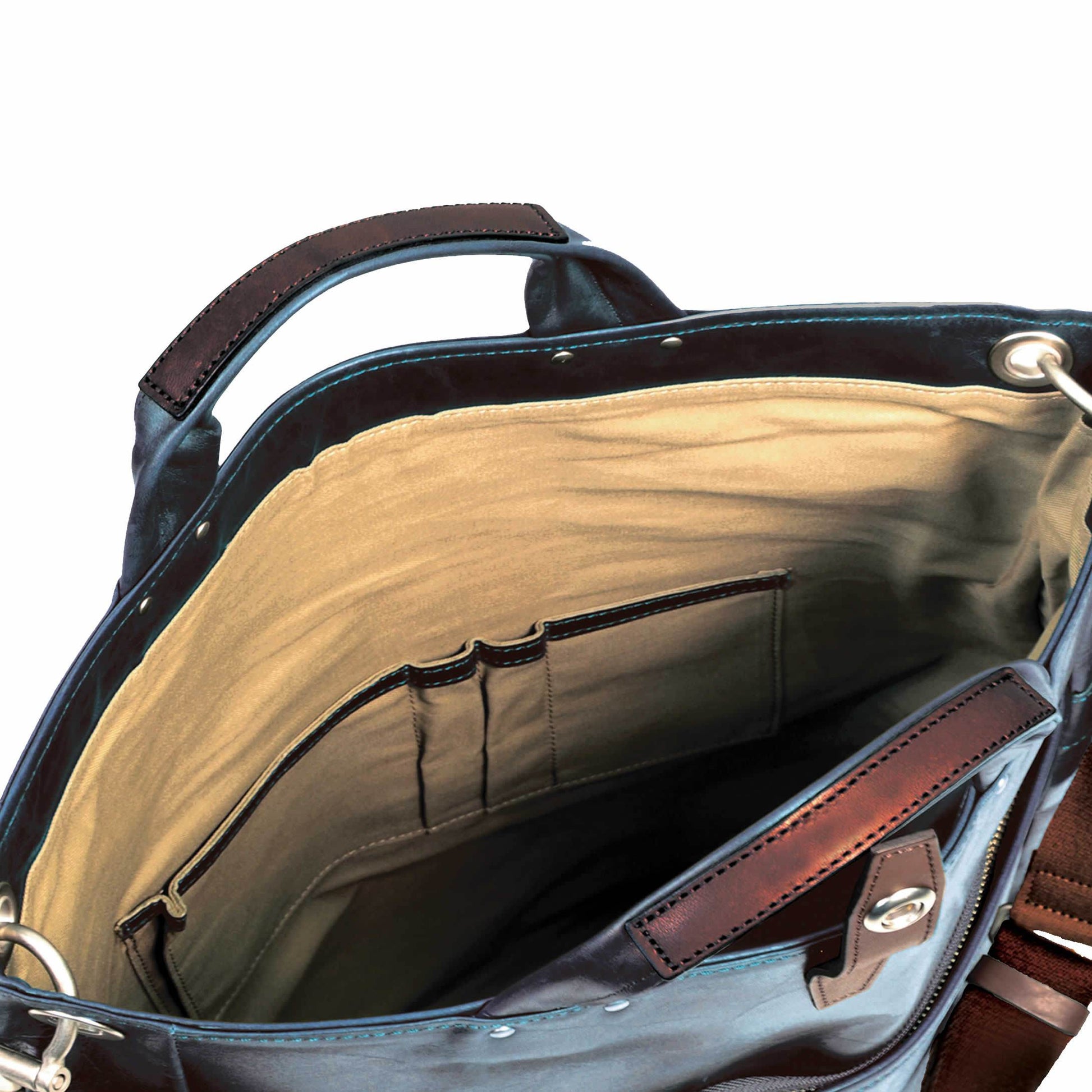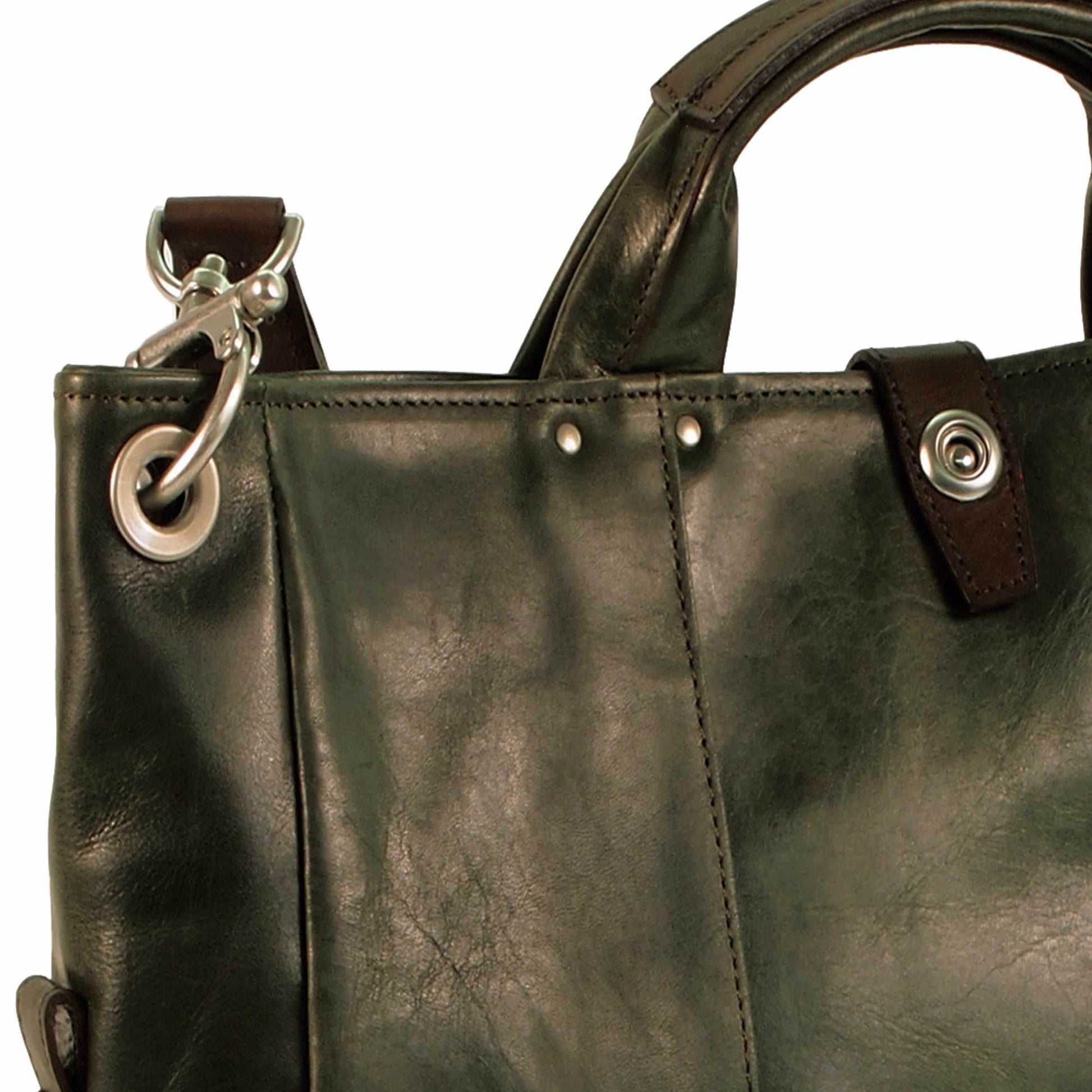 軽量な牛革を使用した2WAYバッグ。シンプルなデザインながら、両サイドの大きめのハトメに機能を兼ね備えたオリジナルの金具がアクセント。用途によって、口折れショルダーバッグ、手提げバッグとして使えます。カラーはブラック、ダークブラウン、ダークグリーン、ネイビーの深みのある4色展開。 サイズ(横×縦×マチ):35×39/29×14cm 重量(本体のみ):約830g 日本製 (染料仕上げの牛革使用の為、多少の色落ちがする場合が有ります)