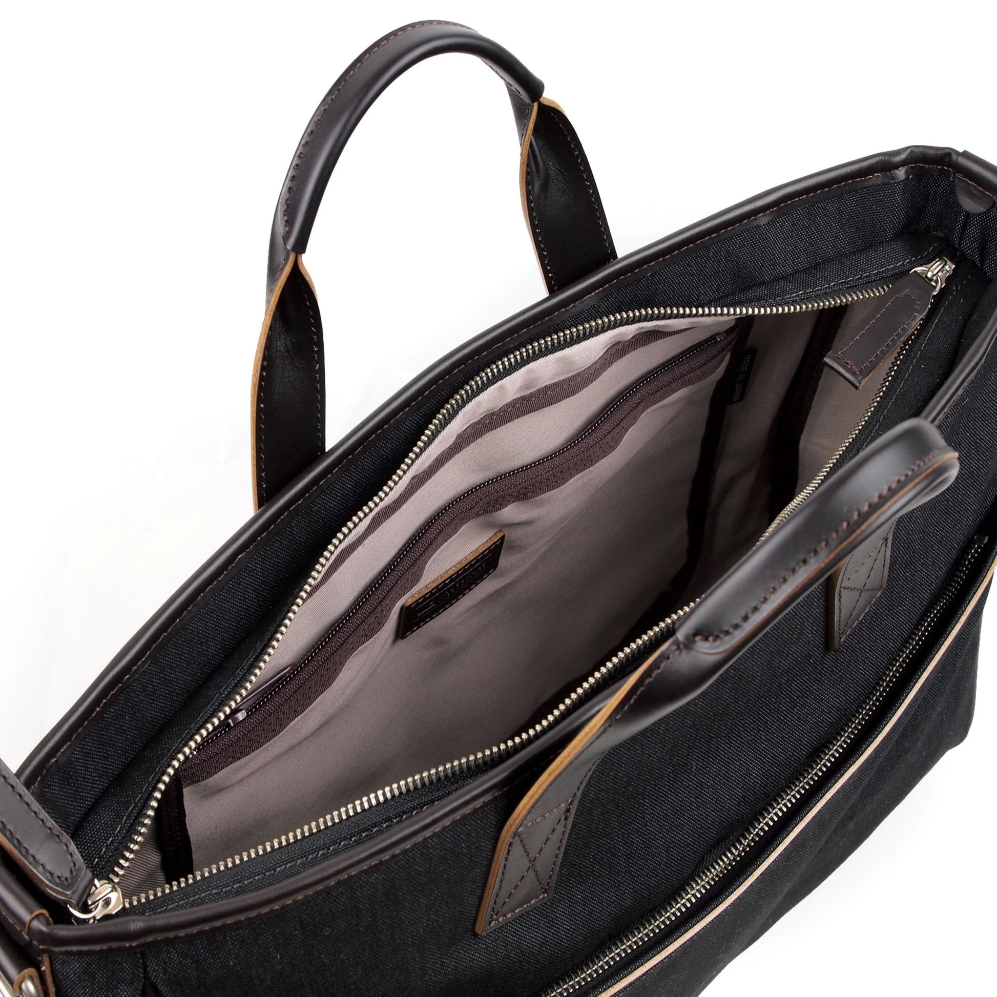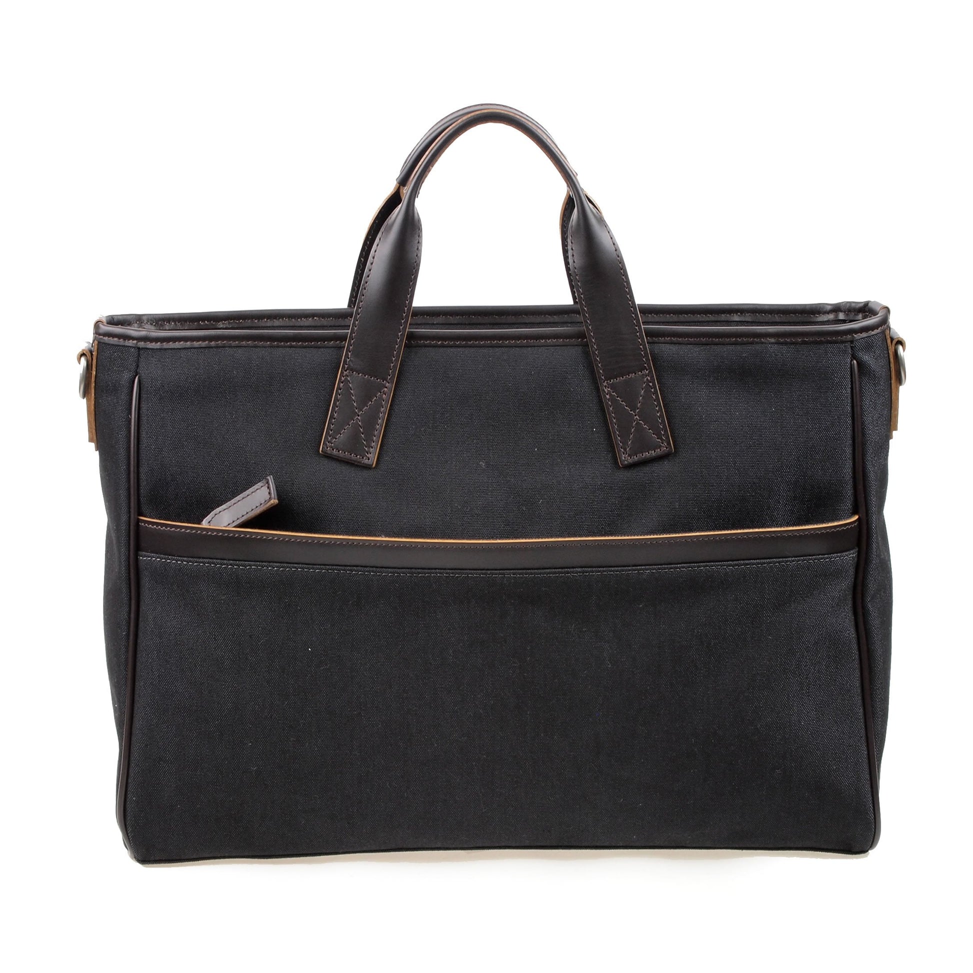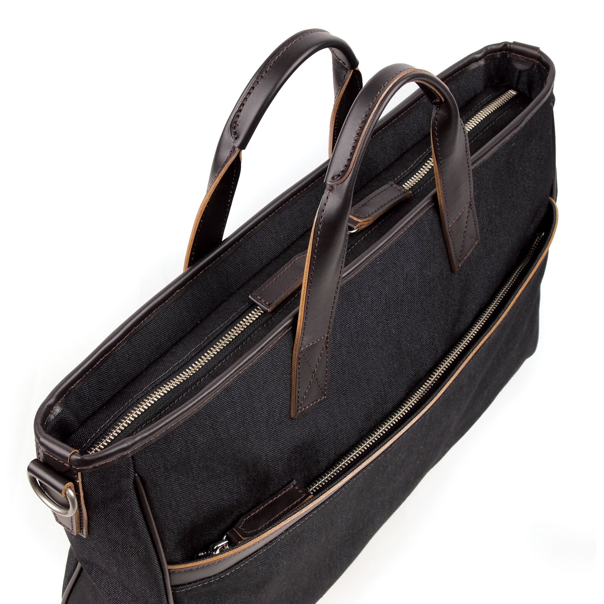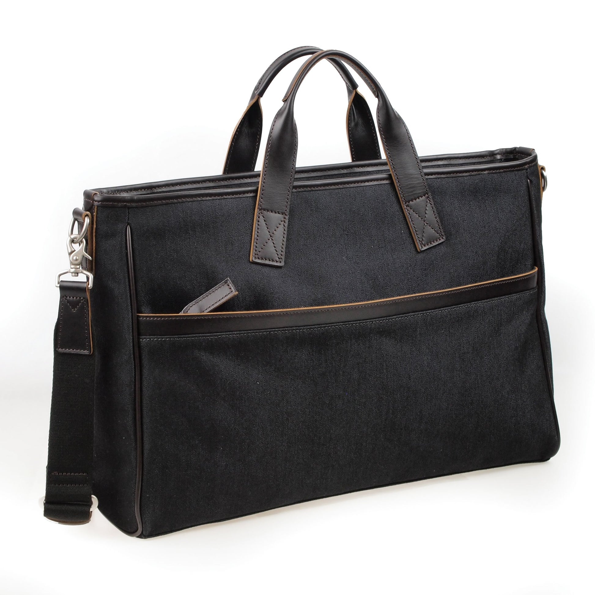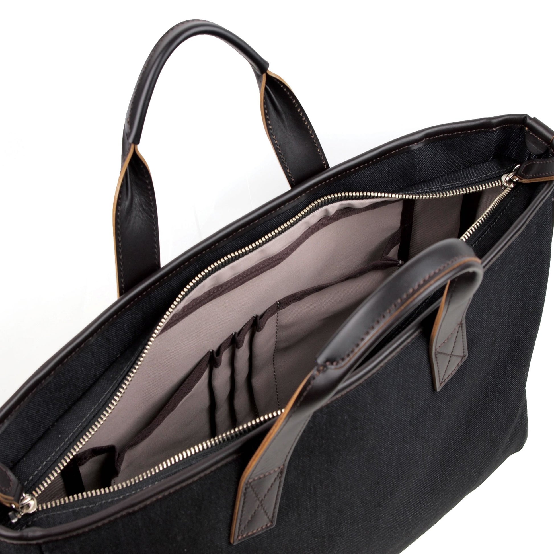 ナイロンとコットンで織り上げ、光沢感とナチュラル感のあるデニム調に仕上げ、撥水性や防汚性に優れたNUVA加工を施して機能性も兼ね備えた生地に牛革をトリミングしたオンオフ問わず、幅広く使えるトートタイプのバッグです。持ち易いハンドルにも一手間かけてみました。カラーはダークグレーのみ。 サイズ(横×縦×マチ):42×30×11cm 重量(本体のみ):690g 日本製
