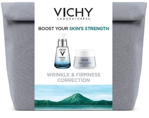 Reveal you radiance and boost your skins strength with Vichy's SPECIAL OFFER skincare bundles. This luxury pouch contains the hyaluronic acid booster - Mineral 89 and anti-wrinkle and firming care - LiftActive Supreme